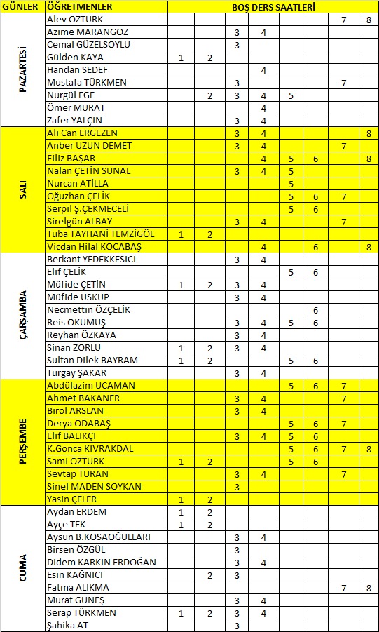 Öğretmenlerimizin nöbet günü ve boş ders saatleri için yıklayınız.